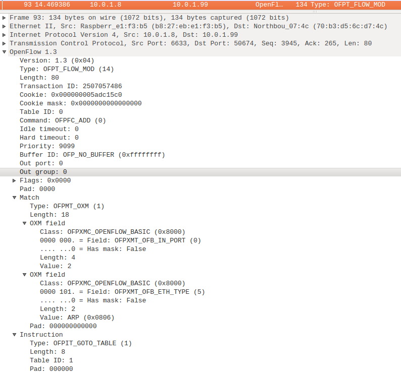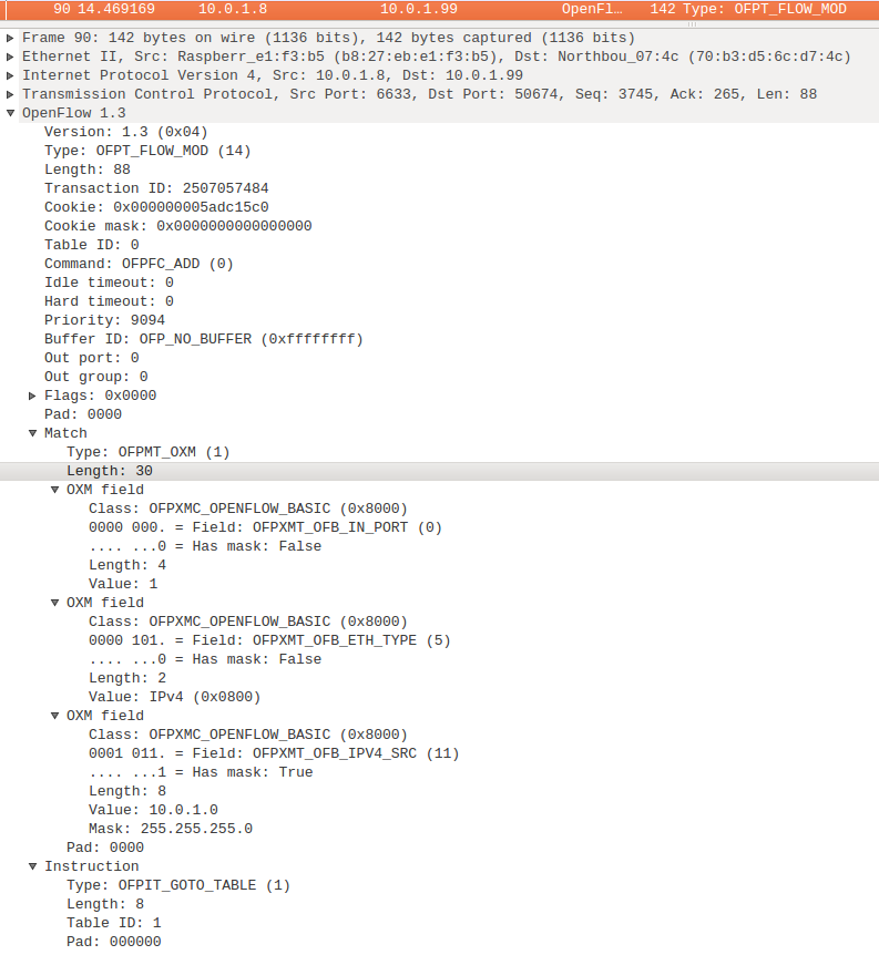 0 | 49 | 9094 | IPv4 | 10.0.1.0/24 | 3 | GOTO TABLE 1 | Paquete | Todos los paquetes IPv4 con origen en la red 10.0.1.0/24 recibidos en puerto 3 pasan a la tabla 1 |