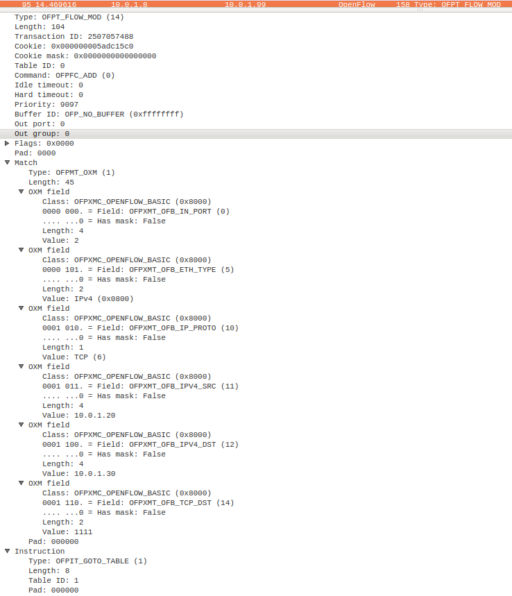 0 | 32 | 9097 | IPv4 | TCP | 10.0.1.20 | 10.0.1.30 | 1111 | 1 | GOTO TABLE 1 | Paquete | Todos los paquetes TCP recibidos en puerto 1 de 10.0.1.20 hacia 10.0.1.30:1111 pasan a tabla 1 | ||